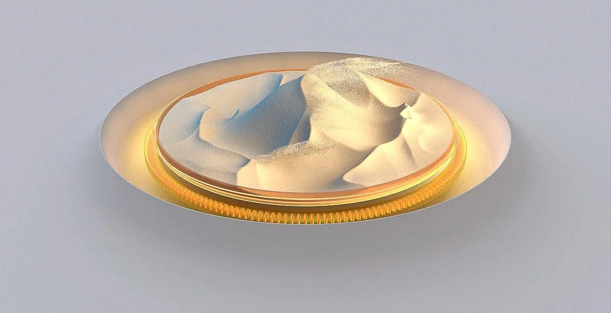 Drive mode visualizations showing “Sand” mode and “Sport” mode. Sand mode is rendered in a light and dark theme. As a user rotates through drive modes in the vehicle the animation plays in the center console display.