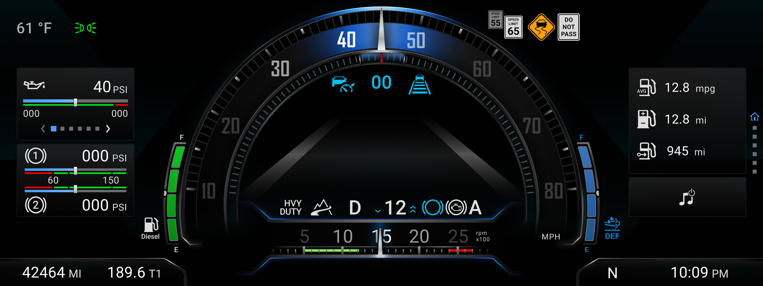 The Mack Pioneer and Anthem which launched in early 2025 feature a digital instrument cluster screen that presents current operational information, a collection of applications and includes both a traditional analog speedometer view and digital speedometer view.